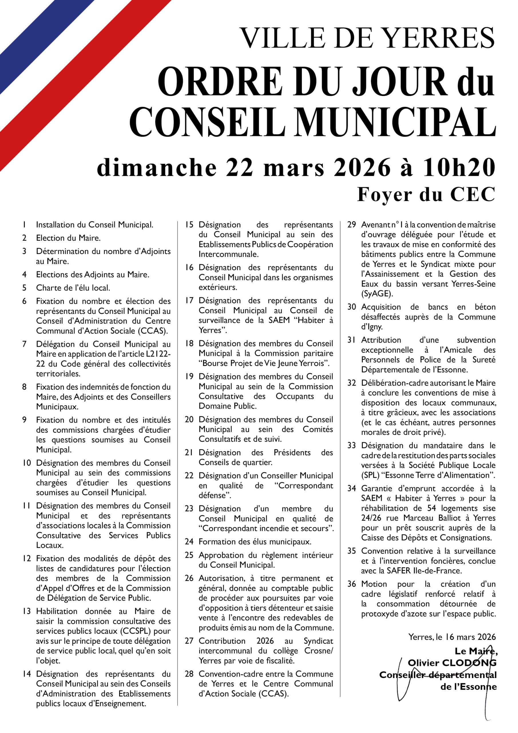 Lors de ce premier Conseil Municipal les membres ont élu Nicolas Dupont-Aignan Maire de Yerres et ont choisi les Adjoints au Maire et leurs délégations.