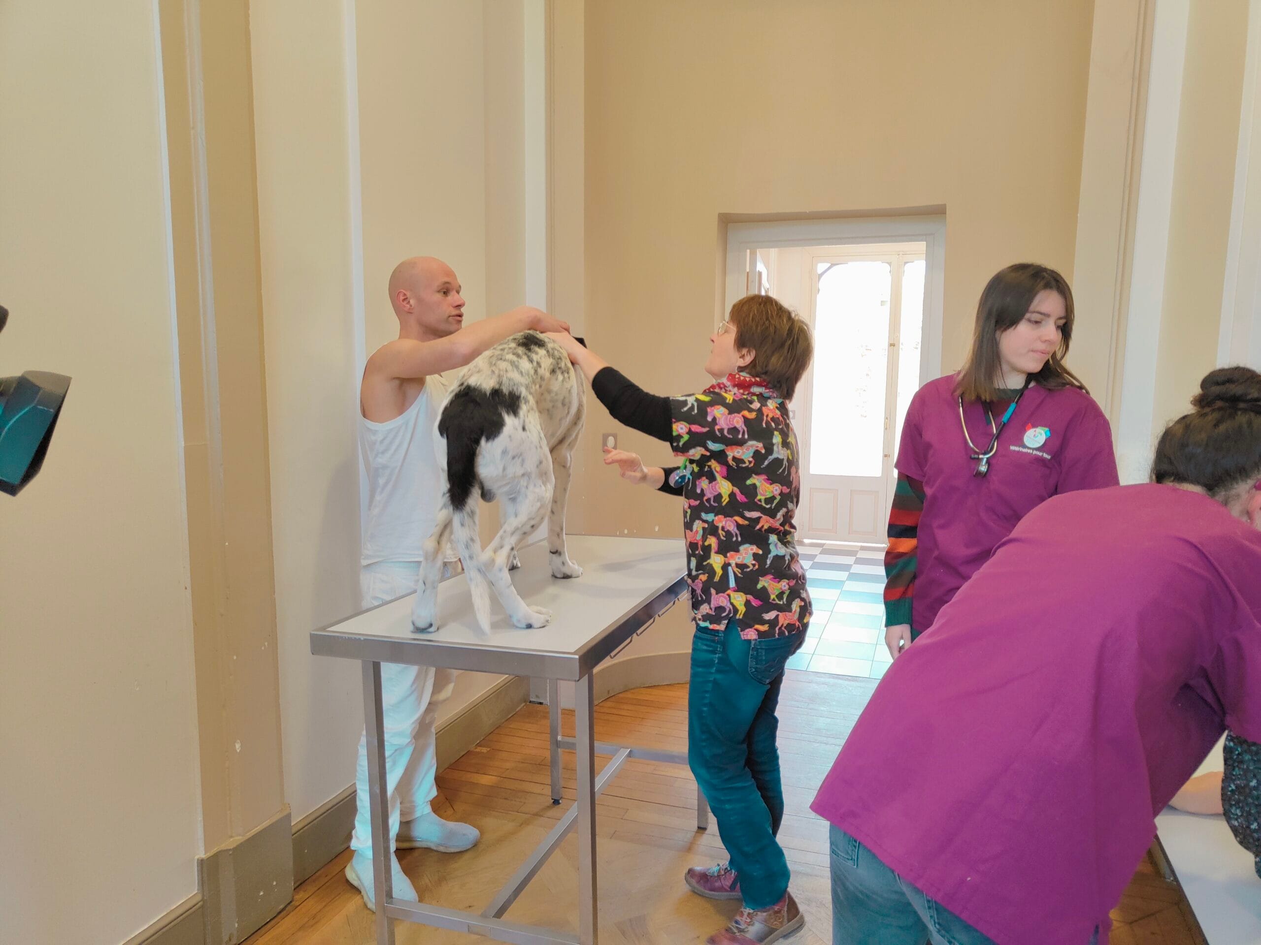 Durant une après-midi, une vétérinaire bénévole épaulée par des étudiants stagiaires de l’École vétérinaire de Maisons-Alfort assure une dizaine de visites et séances de vaccination.